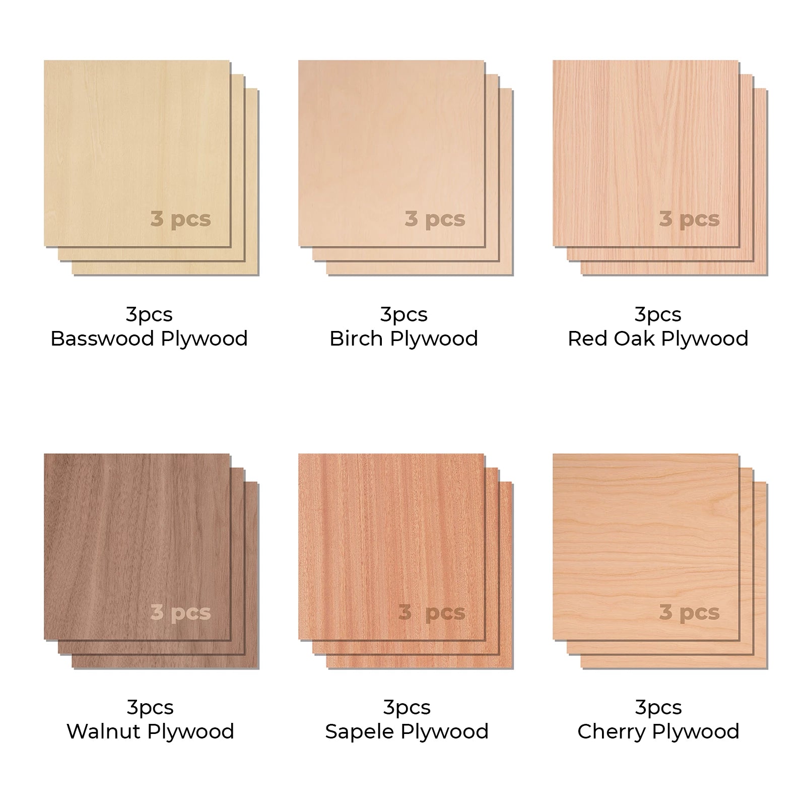 - 12" x 12" x 1/8" premium Basewood plywood, Birch plywood, Red oak plywood, Walnut plywood, Bubinga plywood, and Cherry plywood won't warp or deform.