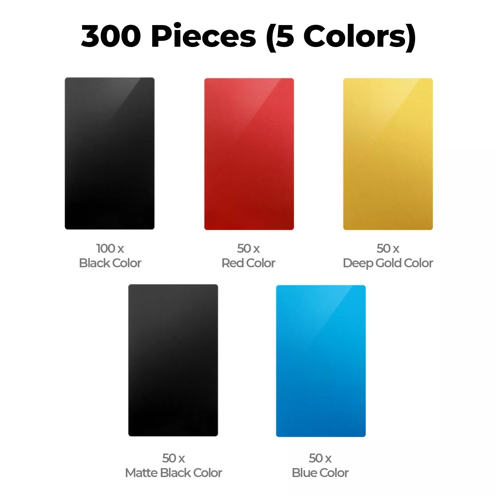 - The package contains 5 different colors, black, deep gold, red, blue, and matte black, 300 metal cards in total. The variety of colors can meet your different needs, and there is enough quantity for you to make business cards for yourself or others.
