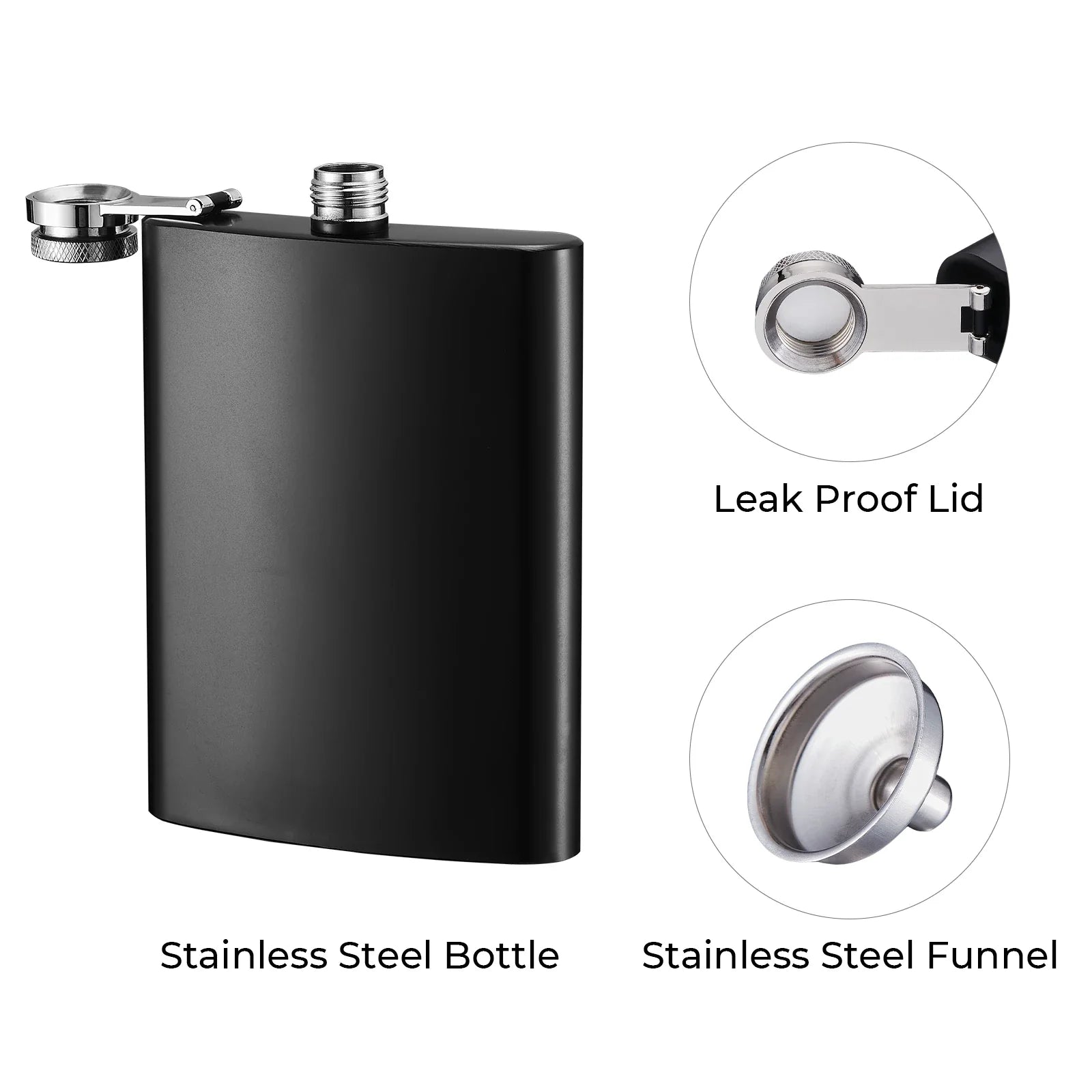 - The stainless steel black hip flask comes with a stainless steel cap and stainless steel funnel. The cap seals tightly to ensure that vodka, whiskey, or other favorite beverages won't leak and go to waste. The included funnel makes it easy to pour liquids. It comes in its gift box, so you can use it as a gift directly to others.