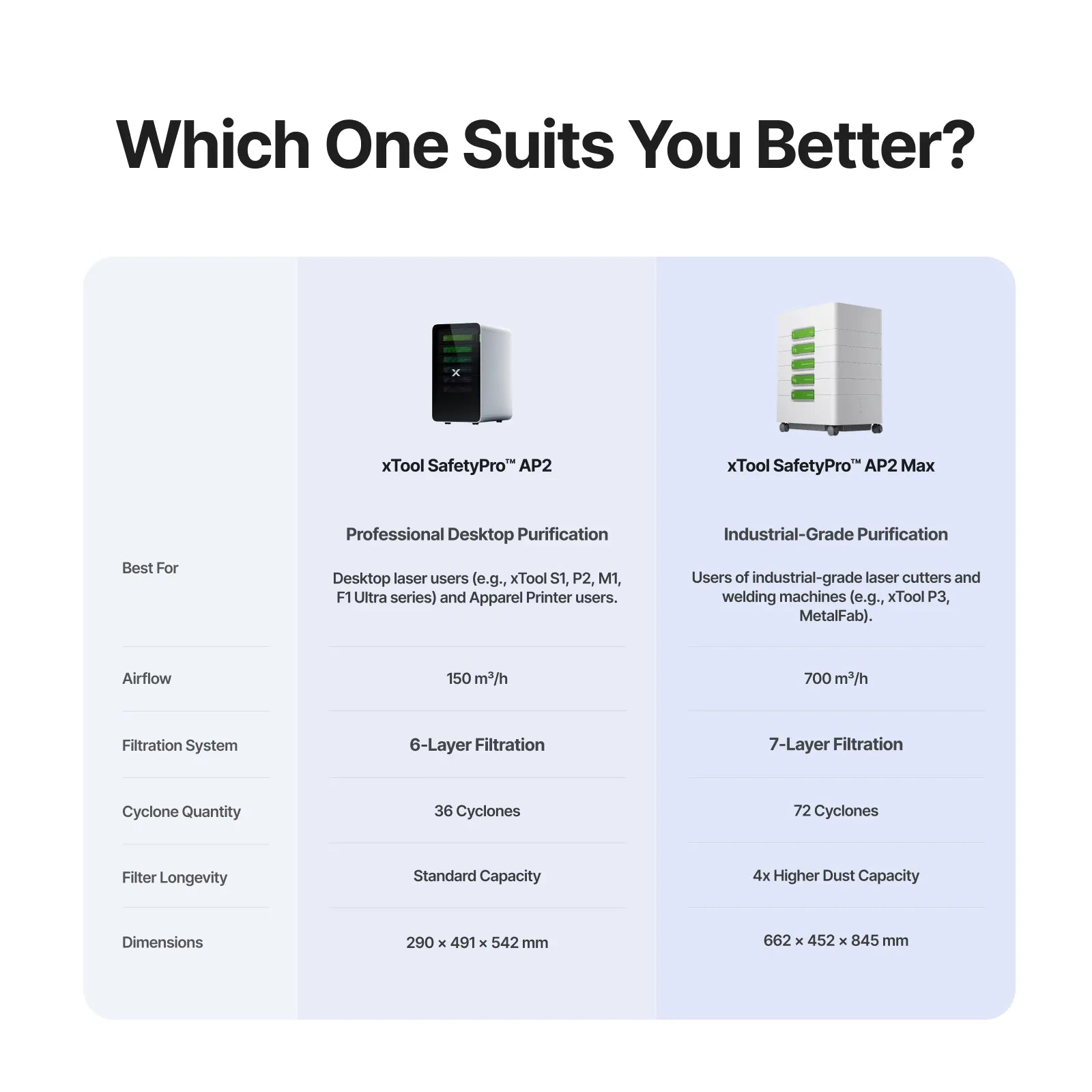 The AP2’s 150m³/h airflow efficiently purifies desktop tasks. The AP2 Max unleashes a dominating 700m³/h, engineered for thick, large-format industrial laser and welding jobs.