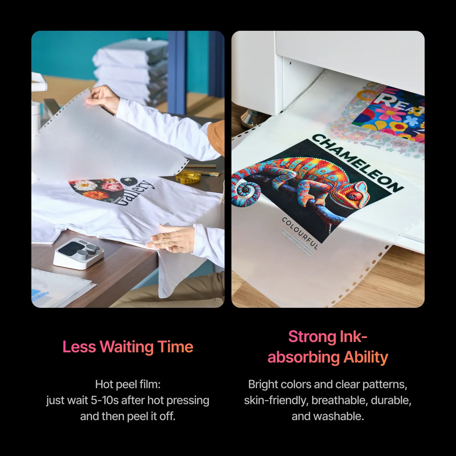 - This product is a hot peel film that can be easily removed after waiting 5-10 seconds post-heat press. Heat transfer creation can be done quickly without the need to wait for a long time to cool down.