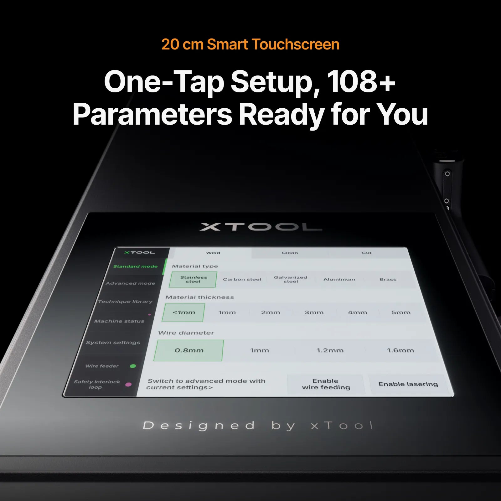 We have designed xTool MetalFab to ensure a smooth and simple user experience, so you don’t need to worry about lacking experience—you can get started in just five minutes! It features the 550g ultra-light integrated welding gun which enables a 5-second quick-release. The 20,3 cm Smart Touchscreen has 108+ built-in parameters for one-click use.xTool MetalFab can weld up to 5mm stainless steel or carbon steel, and we have passed SGS welding quality tests, so you can rest assured about its performance and reliability!