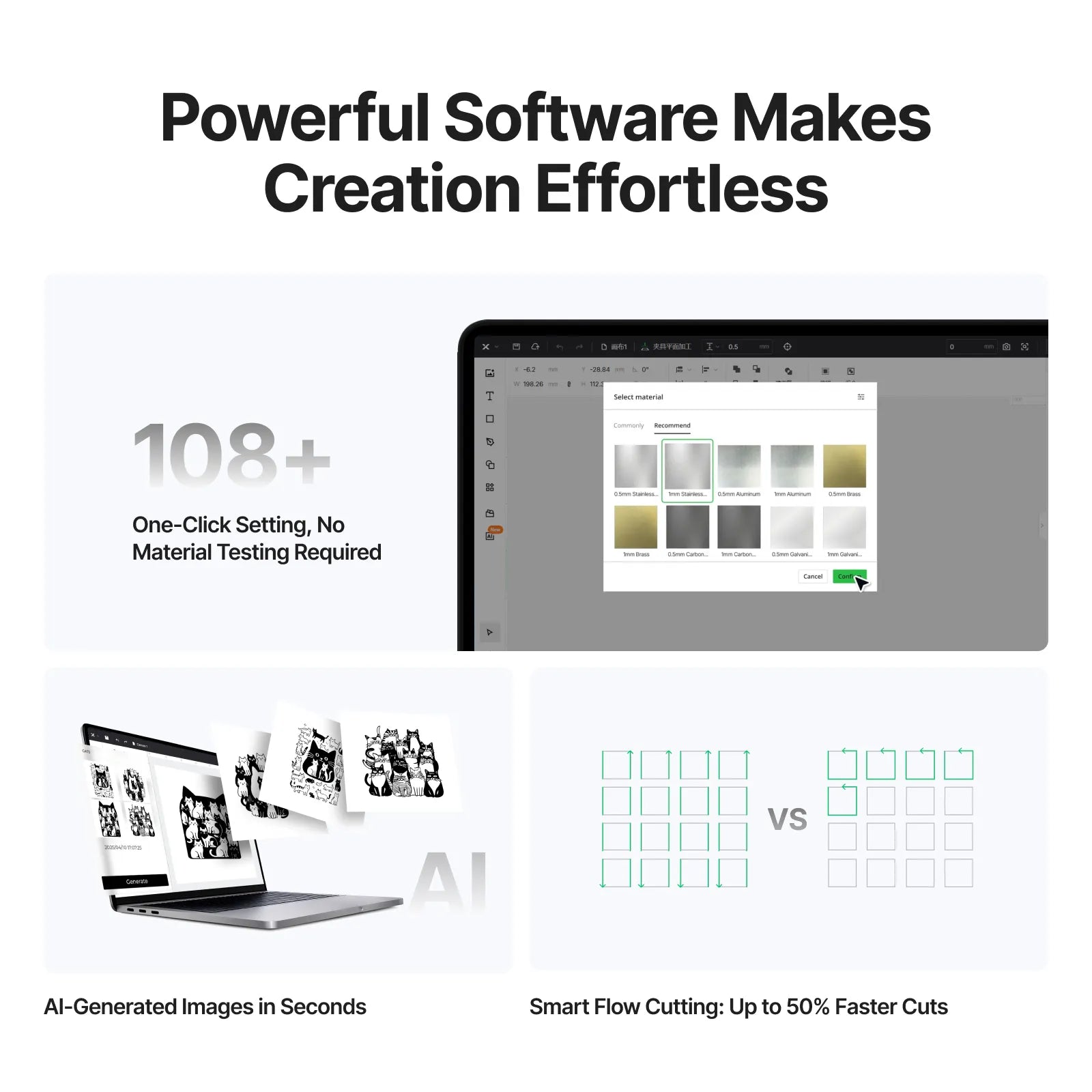 xTool MetalFab operates on the XCSSoftware, designed for intuitive control and streamlined workflows:It features the Material EasySet Library with100+ pre-optimized parameters for 30+ materials. You only need to select the material you want to cut, and all parameters can be applied with a single click. It also supports Auto Lead-in Lines, Automatic Path Optimization, which significantly improves cutting efficiency.