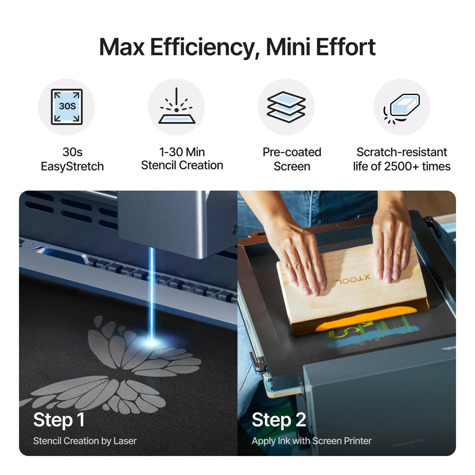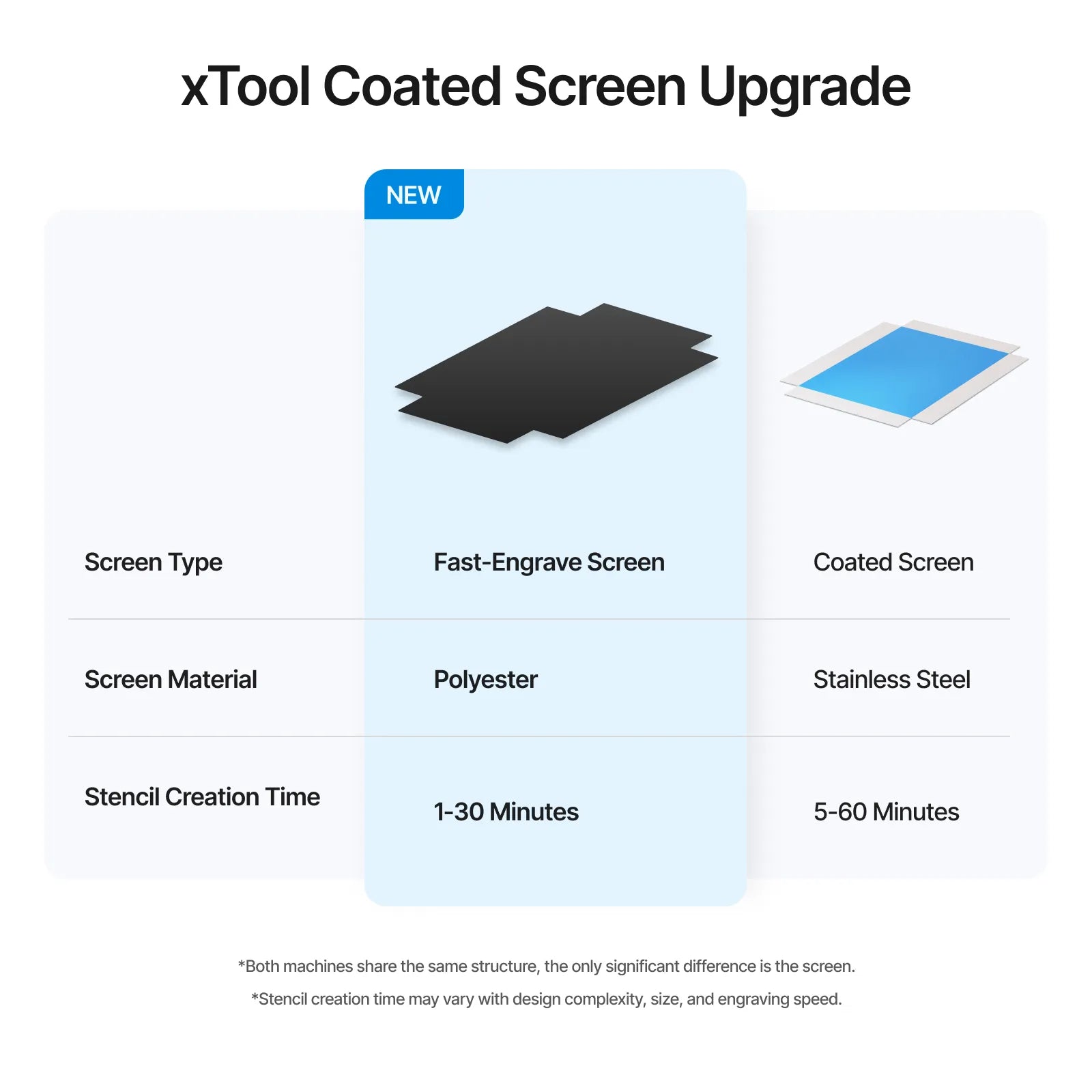 - Efficient Processing: Polyester fast-engrave screens take significantly less time to process than traditional screens with the same xTool model and the same power, with an average engraving processing time of only 1-30 minutes compared to 5-60 minutes for traditional screens. This results in a significant increase in productivity, helping you to complete your print jobs faster.