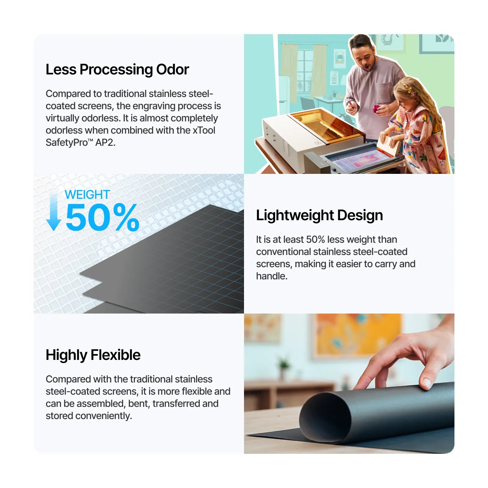 - Minimal Odor: During the engraving process, the polyester fast-engrave screen had virtually no noticeable odor. When used with the xTool SafetyPro™ AP2, it creates a nearly odor-free working environment, providing a more comfortable space that boosts productivity.