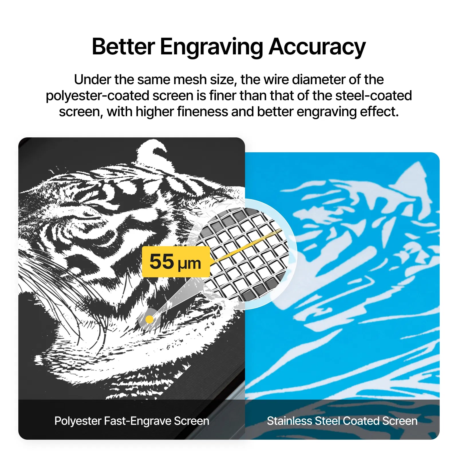 - CMYK Precision and Color Reproduction: The polyester fast-engrave screen excels in CMYK color printing and engraving precision. It delivers more vibrant colors and maximizes detail reproduction compared to traditional steel screens, ensuring every piece achieves the best visual impact.