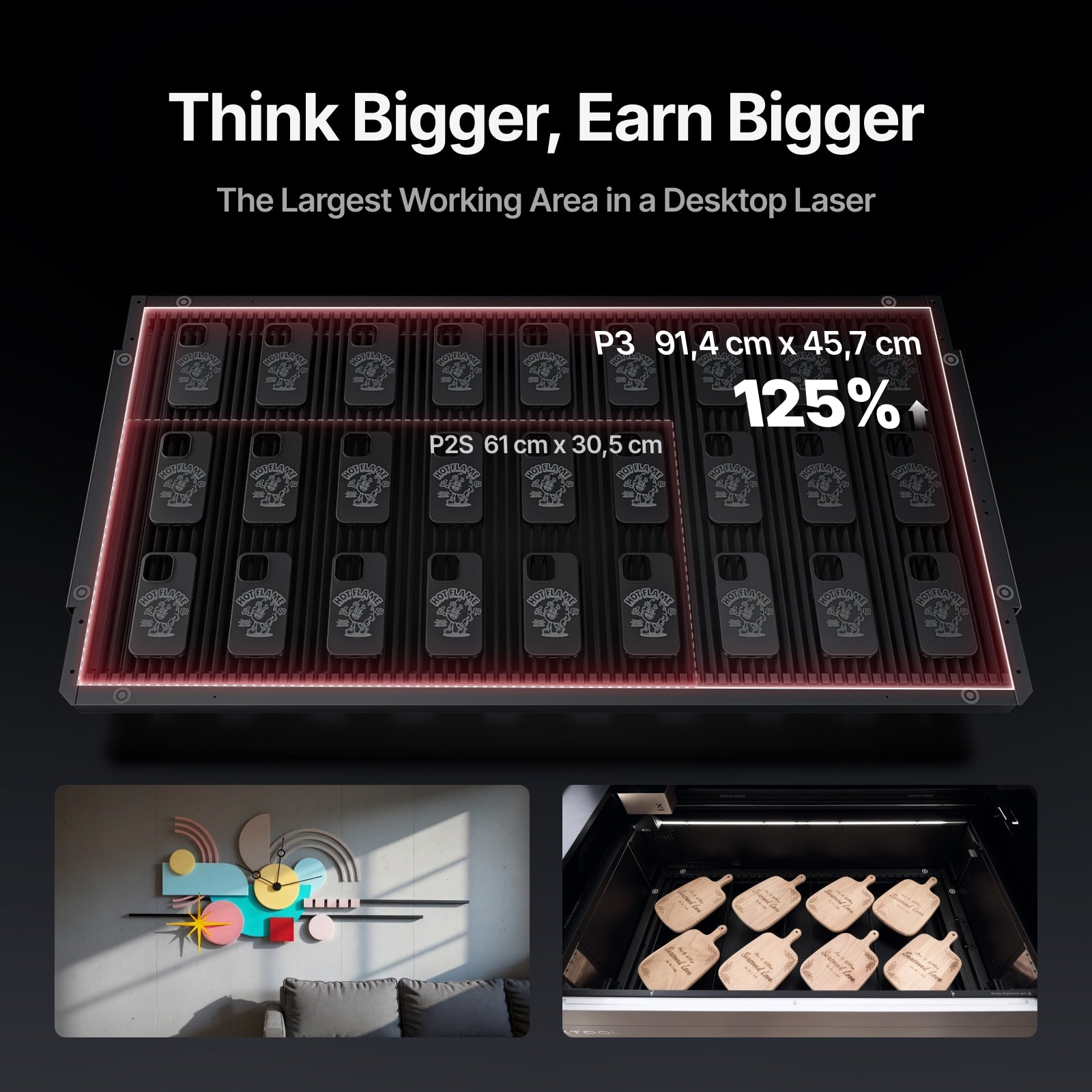 - Working Area: The standard working area of the xTool P3 is an expansive 36" x 18" (915 mm x 458 mm). This is approximately 2.3 times the area of the P2S, allowing you to easily handle large-scale projects or more efficient batch production. Furthermore, for projects that require processing of extra-long materials, the P3 is compatible with the optional Intelligent Conveyor Feeder, which unlocks the ability to work on materials of virtually any length.